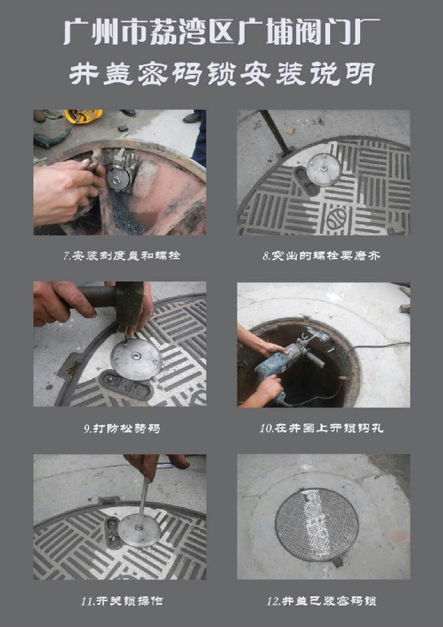 井盖密码锁,由广州市荔湾区PA旗舰厅阀门厂自主研发,已获得国家知识产权局颁发的实用新型专利证书,专利号:ZL 2017 2 0421219.8。